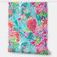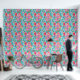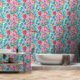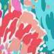 A seamless preppy pattern featuring pink, orange, coral, and red flowers on a minty green background, adorned with round paint splashes and white dots. The design has a hand-painted look, combining vibrant floral elements with whimsical splashes to create a lively and stylish effect.