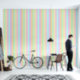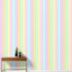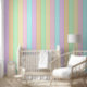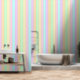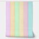 This tropical stripe wallpaper design has cool blue and green tones alongside warm pink, yellow, orange, and purple. It has a light and breezy feel like awnings and beach umbrellas glowing in warm sunlight.