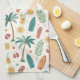 Bright tropical pattern kitchen towel featuring palm trees, surfboards, citrus slices, flip flops, and fruity drinks in a fun summer-inspired style. Ideal for beach lovers, surfers, vacation fans, and anyone who loves colorful tropical aesthetics.