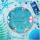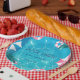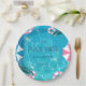 Tropical Summer Pool Party Plates to complement your pool party. The design features a swimming pool with realistic, inviting water, tropical palm fronds, various pink and white floaties, and umbrellas. There are also matching napkins and a party invite available. Splish splash, party on, and have fun!