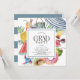 This cute grad/graduation party invitation features a white background with a beach umbrella, flip flops, tropical mason-jar drink/cocktail, popsicle, watermelon, doughnut, pineapple, straw hat, fresh coconut drink, pinwheel and sunglasses. The reverse side features a white background with blue stripes. Perfect for a summer graduation party on the beach or at the pool side! Personalise it for your needs. You can find more matching products at my store.