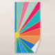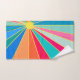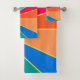 This towel set has a design of a tropical sunrise in reds, oranges, blues, and greens.