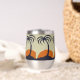 Image printed on drink or water bottle is a photo of an original tapestry crochet wall hanging designed handmade and Copyright © by published designer Delores Chamblin. The picture of the unique handcrafted palm tree silhouette and bright orange sun is reproduced on the thermal drinkware for hot or cold beverages.