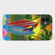 Tropical and colourful ocean sunset behind surfboards, palm trees, a macaw parrot perched on the surf boards, and hibiscus flowers at the bottom.