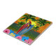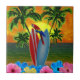 Tropical and colourful ocean sunset behind surfboards, palm trees, a macaw parrot perched on the surf boards, and hibiscus flowers at the bottom.