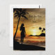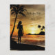 Girl on tropical island with sunset. Golden skies with palm trees and island in the distance. "Wish you were here" phrase.
