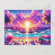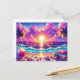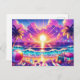 A vibrant and colourful sunset over a tropical beach, framed by tall palm trees on either side. The sky is filled with hues of pink, purple, and orange, as the sun sets on the horizon, casting a brilliant glow over the ocean. Fluffy clouds catch the sunset colours, reflecting beautifully in the calm waters. On the sandy beach, a cosy campfire glows warmly, surrounded by baskets, and rolled-up beach towels on laid-out rugs, suggesting a peaceful and inviting atmosphere for relaxation and enjoyment. Bright stars begin to emerge in the evening sky, adding to the serene setting.