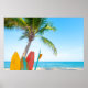 This design features colourful surfboards standing up in the sand with a palm tree, beach and ocean in the background.