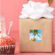 This design features colourful surfboards standing up in the sand with a palm tree, beach and ocean in the background.