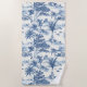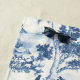 The image depicts a classic toile de Jouy pattern, chraacterised by detailed scenes in blue on a white background. It features tropical landscapes with lush palm trees, rocky terrain, and serene water bodies. There are elements such as small huts, birds in flight, and distant islands, giving the design an idyllic, peaceful feel. The pattern is intricate and evokes a sense of traditional, pastoral elegance often associated with French decorative arts.
