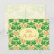 Postcard for friendship. Send a greeting to a penpal with this tropical vibe postcard. "Hello my friend" on the front is easy to change to your preferred greeting. Green fronds and palm 'flowers' make up this ogee style repeating pattern on a sunny yellow background. Palm flowers hang in clumps from a separate sheath that opens to reveal branched clusters of tiny flowers that often become berries, depending on the type of palm. In this hand-drawn design the flowers are yellow with orange to orange-red colors. They hang between the fan-like leaves. The design is printed on both sides of this penpal postcard.