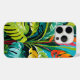This design captures the lush beauty of tropical foliage in a bold, stylised manner. The composition features a striking arrangement of diverse plant leaves, including broad monstera leaves, slender palm fronds, and vivid heliconia. The colour palette is rich and eye-catching, with shades of green ranging from lime to emerald, accented by bright oranges, yellows, and pinks.