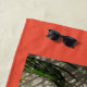 Feel the Tropical Vibes with this Colourful orange beach towel with a Hibiscus blossom, straw sun hat and shadows of palm fronds cast on the sand. This image is original beach photography by JLW_PHOTOGRAPHY.