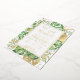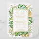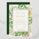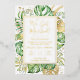 This elegant tropical elopement reception invitation features green and gold palm, philodendron, and fern leaves. An elegant gold foil frame highlights the gold foil text. Gold foil splatters accentuate this exotic botanical design and brings a bit of modern whimsy to the invitation. "We Got Married! " along with the bride and groom's names are featured at the top. Wedding vow details and reception location and date are detailed underneath. RSVP information is on the back of the invitation.