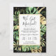 This elegant tropical elopement reception invitation features green and gold palm, philodendron, and fern leaves on a black background. An elegant gold frame highlights the black text. Gold splatters accentuate this exotic botanical design and brings a bit of modern whimsy to the invitation. "We Got Married! " along with the bride and groom's names are featured at the top. Wedding vow details and reception location and date are detailed underneath. RSVP information is on the back of the invitation.