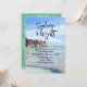Tropical wedding destination invitations. Crystal clear sea water and a rocky coastline is the image behind your choice of text. Names of the couple are at the top in large script. The date and time of wedding is printed to stand out from the remainder of the invitation text. This sunny scene is meant for a small private gathering or a casual celebration.