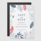Tropical flowers and leaves wedding frame. Navy-blue white and coral-red accent, elegant wedding save the date invitation design.
