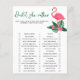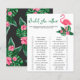 Baby shower invitation design features pink flamingo with lush green palm leaf fronds and tropical hibiscus flowers. "Aloha Baby". A tropical floral pattern with black background colour dresses up the back of the card.