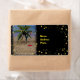 Palm-tree, decorated with christmas ornaments on a sandy beach. Words "Happy Xmas" written in the sand. Let me know if you want me to make any changes.