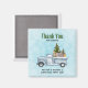 Christmas party thank you magnet with a festive holiday design. A truck carrying Christmas pine trees along with some woodland animals. A bear a fox and a deer standing in the back going for a ride. Design created with watercolors.