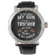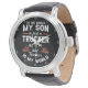 This heartfelt wall clock celebrates a mother or father's immense pride in their truck driver son. Against a black background with an orange rim, it features two orange semi-trucks. The text "TO THE WORLD MY SON IS JUST A TRUCKER BUT TO ME THAT TRUCKER IS MY WORLD" is powerfully displayed in distressed white and orange fonts, making it a touching tribute to a beloved son in the trucking profession.