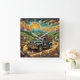 Embark on a musical journey with this inspired folk art print. A vintage truck takes center stage on a winding road, surrounded by scarecrows playing banjos and guitars. The warm hues of the rising or setting sun cast a magical glow over the mountains and clouds. Apple trees, pumpkins, and corn stalks create a sense of autumnal abundance. This intricate artwork, filled with vibrant colors and intricate patterns, is perfect for fans of folk art