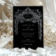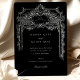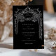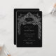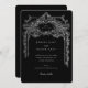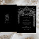 This sophisticated wedding invitation features a striking black background adorned with intricate white floral and architectural elements. The front of the card showcases an ornate arch, framing the wedding details with timeless elegance. The combination of the refined serif font and the delicate white floral accents against the dark backdrop creates a dramatic and luxurious aesthetic, perfect for a formal or evening wedding. The back of the card continues the refined theme with a finely detailed urn overflowing with flowers, adding a personalised and elegant touch. This invitation is ideal for couples seeking a blend of classic sophistication and modern style.