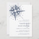 Coastal chic engagement party invitation features a vintage hand drawn style nautical compass rose illustration, with your engagement party details in classic navy blue. Perfect for beach, summer, or nautical engagement celebrations, these coastal style invitations reverse to wide blue and white stripes. Designed to coordinate with our True North nautical wedding and event collection.