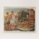 16” x 20” jigsaw puzzle with a vintage image of an ad run by Cannon Mills for their Cannon towels. This ad shows a group of handsome, young soldiers in the tank corps recreating around a pool. One is standing guard, one is in a jeep, and the rest are enjoying the antics of a soldier, perhaps the sergeant, using his towel as a toga white being crowned with a make-shift laurel wreath.