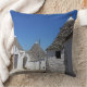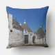 Throw pillow with traditional white plaster trulli houses with stone tiles in conical roofs in a small street in the town Alberobello, Itria Valley in Puglia, Italy.