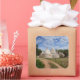 Square photo sticker of the white stone, cone shaped traditional trulli houses with a driveway and a garden with olive trees under a nice sky on a vacation resort near Alberolbello in Puglia/Apulia in southern Italy.