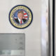 Elegant and stylish round seal design with a photo of President Donald Trump, smiling with a border of stars. Text around the perimeter reads President Donald J. Trump, Keep America Great!. Patriotic American flag in the background, this product makes an ideal Christmas gift for a Trump supporter husband, boyfriend, dad, wife, or anyone! Celebrate inauguration or re-election campaign with ths beautiful keepsake memorobilia collectible collectors gift.