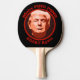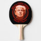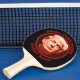 Here's a funny ping pong paddle that will be a real conversation starter! It has an artistic portrait of Donald Trump in a circular red frame border. The curved text above and below the image says "Make PING PONG GREAT again". The image is repeated on both sides.