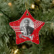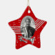 Trumpet star holiday photo ornament in red with silver music notes and photo ornament for your favourite musician. Personalise text on back as preferred.