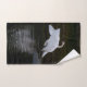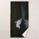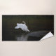A photograph of a white swan stretching out it's wings whilst wading in a shallow river.