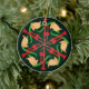 This dramatic ornament features a beautifully crafted design of trumpets and ribbons. Musicians and non-musicians alike will enjoy the bold red trumpets, parchment and ribbons against the dark green circle. On the back is a design of a bright star, Christmas trees and candles.