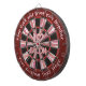 Dark red design bacon dart board. Centre with bacon saying with letters created from bacon strips. Two custom text areas on outer ring.