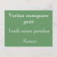 A dark mint green postcard with a latin phrase and the english translation. "Truth never perishes" is a quote by Seneca, a Roman writer.