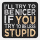 “I’ll try to be nicer if you try to be less stupid”. See my store for more items with this design.