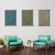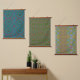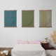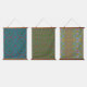 tryptic of blue and green patterns on textile hanging tapestry