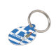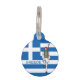 Greek Evzone guard (tsolias) icon holding a gun, wearing red fez, fustanella and tsarouchia. Flag of Greece background. Custom text on both sides.