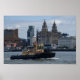 The SVITER AMAZONAS tug boat passes the Mersey ferry dock and the Liverpool Liver building with the two liver birds on top.