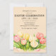 This beautiful Easter invitation features a lush watercolor border of soft pink and creamy yellow tulips blooming across the bottom in full spring glory. The warm peach background and elegant typography give this card a polished, sophisticated feel perfect for an Easter celebration or egg hunt gathering. Easily customize all event details including date, time, address, and RSVP information to make it perfectly yours. Send this stunning invitation to your guests and let the springtime fun begin.
