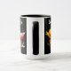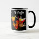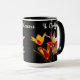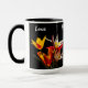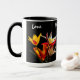 A bunch of colourful sunlit tulips of yellow, red, purple colours against the black background on both sides of the mug. Text: Love, Flowers, & Coffee along the top rim. Funny customisable coffee mug for anyone. You can change images and you can change or delete all the texts.