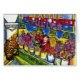 A colourful drawing of a lady selling tulips at the Pike Place Market.