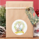 Welcome spring with a classic watercolor illustration of a bunny dressed in blue polka dot dress holding a barnyard hen. A wreath of spring tulips surround the rabbit with a yellow ribbon banner wishing all a Happy Easter. Use this sticker on party favours, gift packages, table decorations and more.
