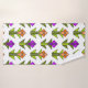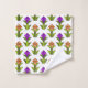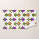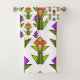 This towel set has an art deco design made from diamonds, triangles, and polygons making tulips in orange and purple with green stems and leaves.