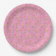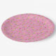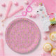 Tulips and butterflies pink pattern paper plates.  Design features pink, yellow and orange tulips on a pink background.  Pink and yellow butterflies frolic around the tulips, enhancing the joyful aesthetic with a whimsical touch!