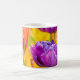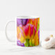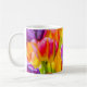 Colourful violet, purple, pink tulips on a flowerbed. Virtually all the rainbow colours present. Bright and positive floral scene. Macro photography.