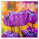 Colourful violet, purple, pink tulips on a flowerbed. Virtually all the rainbow colours present. Bright and positive floral scene. Macro photography.